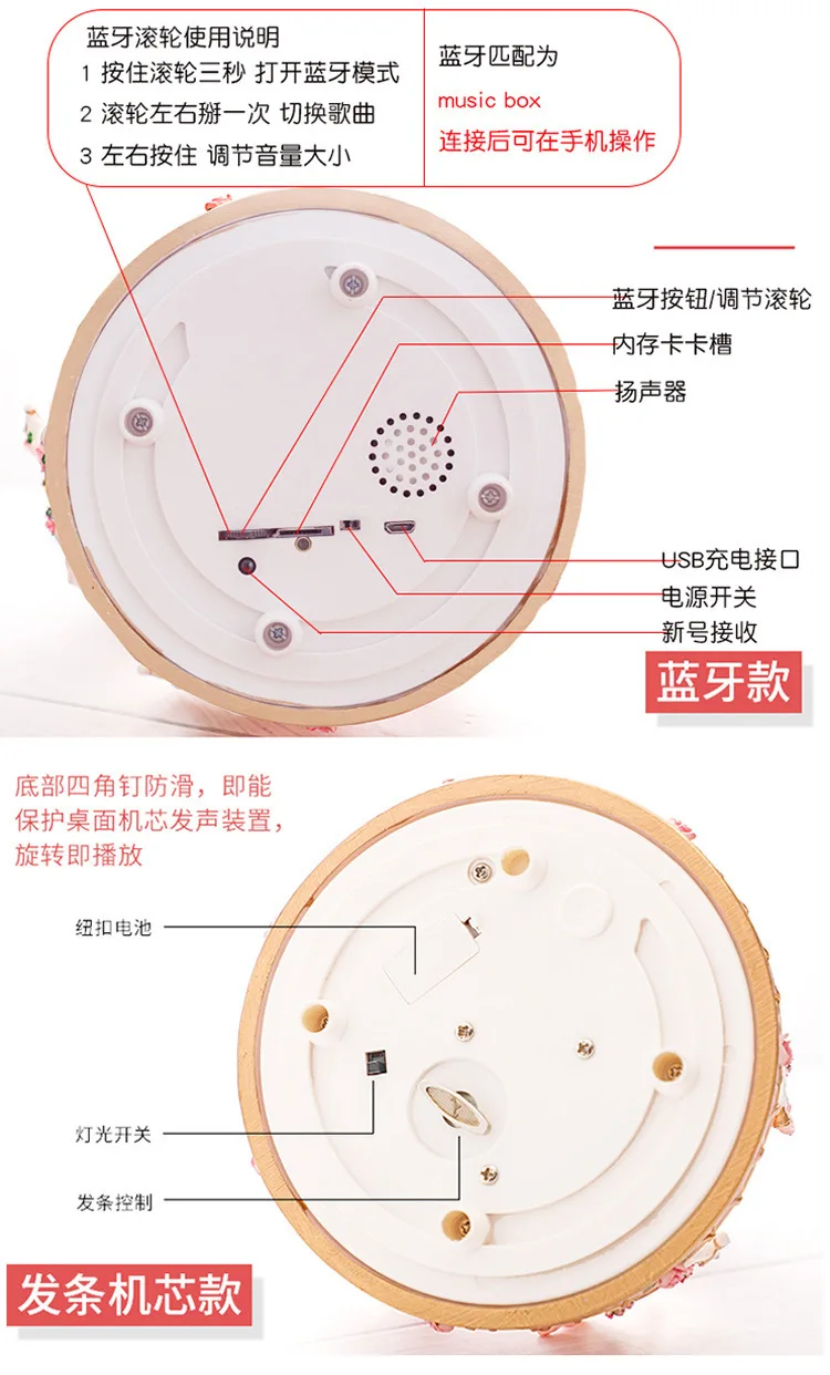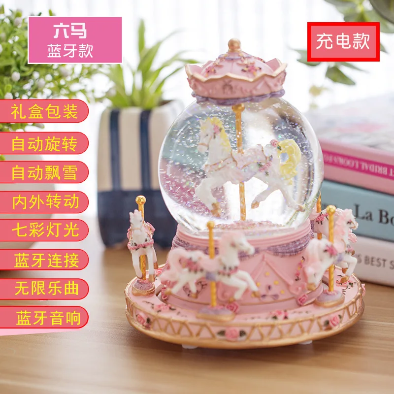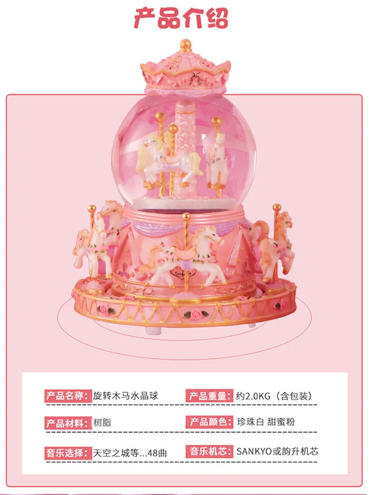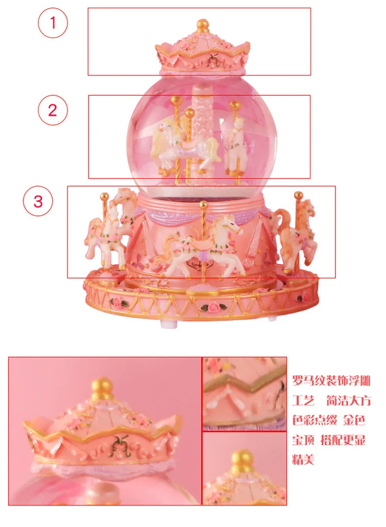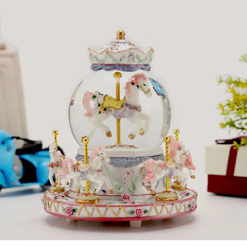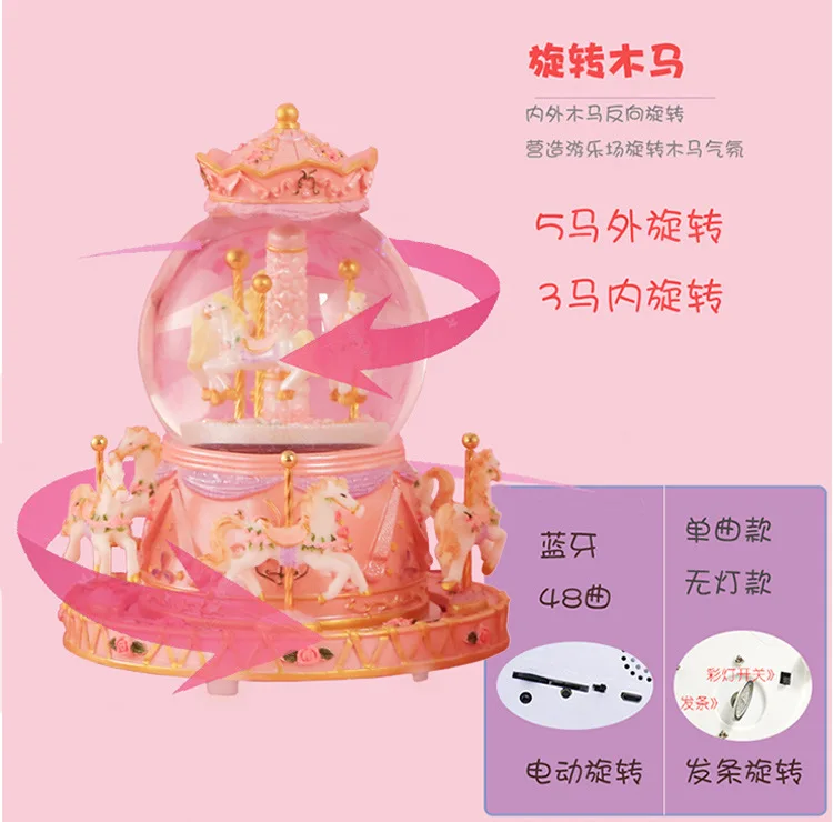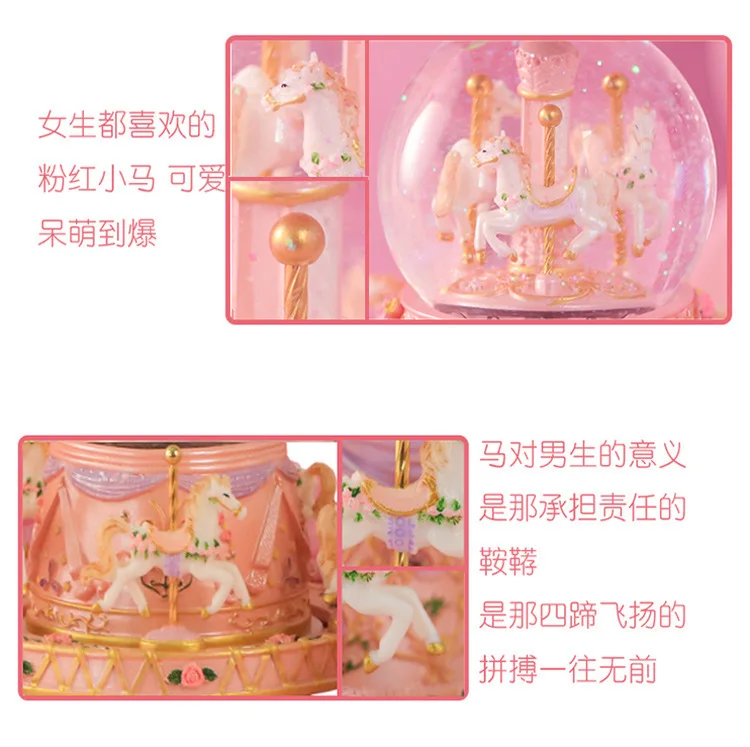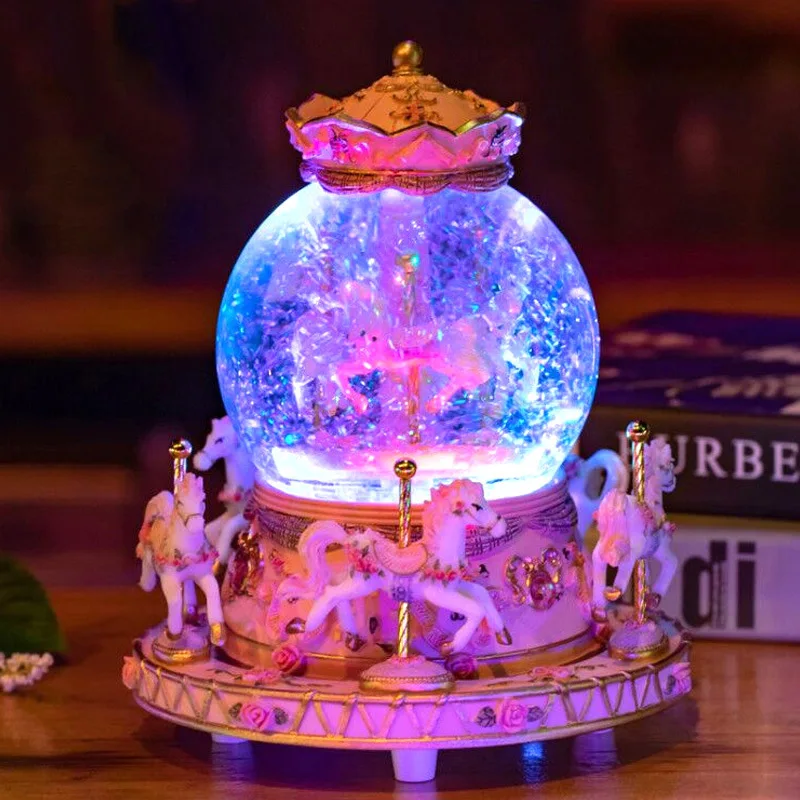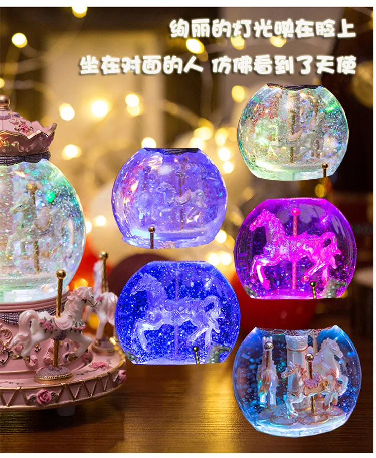 Carousel crystal ball music box, automatic snowfall with light music box, Christmas birthday gift